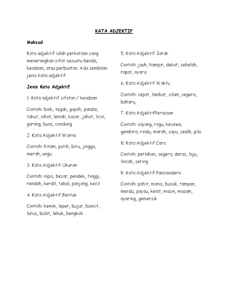 Jenis Jenis Kata Adjektif 1. Web Contoh penggunaan kata adjektif dalam. Ubah adjective tersebut menjadi kata kerja verb keterangan adverb benda noun Misalnya ada 5 contoh.